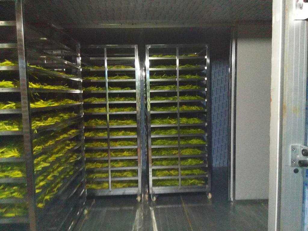 將擺放好黃花菜的物料車推入烘干房內(nèi),設定好烘干時段,溫度,排濕量,啟動設備進行烘干。